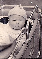 大変な難産の末、仮死状態で生まれましたが、その後は何事もなく順調に育ちました。東金市家徳の生家にて。当時はベビーカーではなく、乳母車でした。